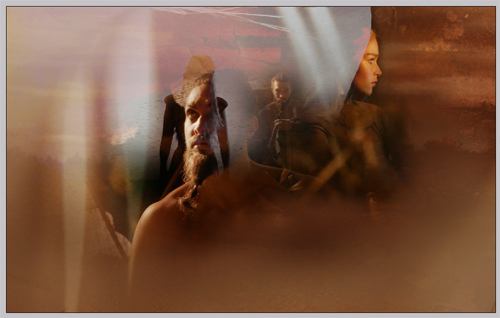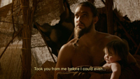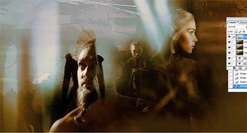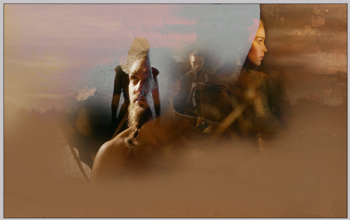 I continued with the basic blending and used the screencap of Khal Drogo's face, placed in on my canvas, resized it (keeping the picture slightly bigger than the other two, because I wanted his and Danni's face to be the main focus of the wallpaper - it was meant to be an emotional piece, so I wanted to see the emotions) and again, erased the rest to blend it with the others: