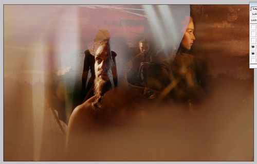 At that moment I noticed that the transition between the blended screencaps and the light-beige canvas was a little too visible, so went back to my backgroud layer (the very first one at the bottom) and grabbed my